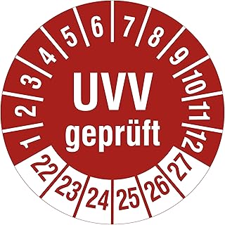 Labelident Mehrjahresprüfplakette UVV geprüft 2022-2027 - Ø 30 mm - 144 widerstandsfähige Prüfplaketten in der Packung, Vinylfolie, rot, selbstklebend