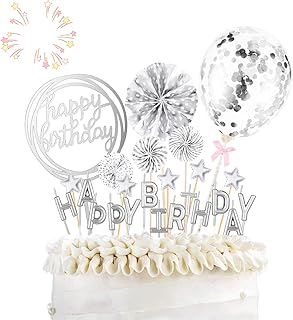 ETHEL Cake Topper Happy Birthday Glitter Cake Topper Kuchendekoration Geburtstag Tortendeko mit Sternen Konfetti-Luftballons und Papierfächer für Geburtstagsfeier Dekoration (Silber)