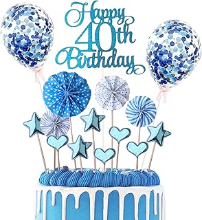 Banydoll Tortendeko Geburtstag, 40 Kuchendeko Geburtstag Blau, Happy Birthday Cake Topper mit Konfetti Luftballons Papierfächer für 40 Geburstagstorte